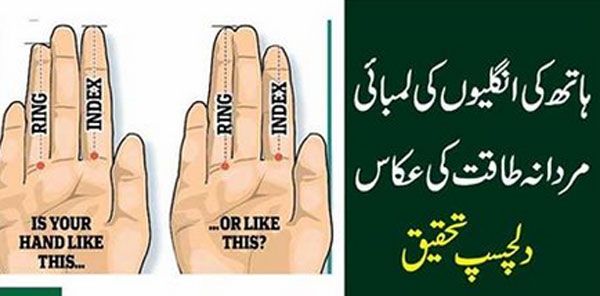 سیول(نیوز ڈیسک) ہاتھ دیکھ کر قسمت کا اندازہ تو شاید لاگایا جاسکتا ہے یا نہیں لیکن ایک تازہ سائنسی تحقیق کا کہنا ہے کہ مردوں کی دائیں ہاتھ سے ان کی جنسی زرفیزی کا اندازہ لگایا جاسکتا ہے۔جنوبی کوریا کی گیچن یونیورسٹی کے ماہرین نے معلوم کیا کہ مردوں کے دائیں ہاتھ کی انگلیوں کی لمبائی سے سپرم پیدا کر نے والے اعضاءکی جسامت کا اندازہ کیا جاسکتا ہے۔اس کیلئے ہتھیلی کو اپنے سامنے رکھ کر بڑی انگلی کے دائیں اور بائیں والی انگلی کی لمبائی کو دیکھیں ۔اگر شہادت والی انگلی کی لمبائی انگوٹھی والی انگلی(بڑی انگلی کے بائیں طرف والی انگلی) کی لمبائی سے زیادہ ہے تو سپرم پیدا کرنے والی اعضاءکی جسامت قدرے چھوٹی ہے اور جس جنسی ذرخیزی قدرے کم ہو گی ۔ جبکہ انگوٹھی والی انگلی کی لمبائی شہادت والی انگلی سے زیادہ ہونے کی صورت میں اعضاءکی جسامت اور سپرم کی مقدار زیادہ ہو گی۔اس تحقیق میں 20سے 69سال ممر کے 172مردوں کا مطالعہ کیا گیا۔