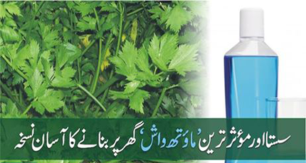 گھر پر ماﺅتھ واش بنانے کے لئے آپ کو آدھی مٹھی اجوائن اور ایک چوتھائی گیلن پانی کی ضرورت ہے۔ سب سے پہلے ایک برتن میں میں پانی ڈال کر اسے ابال لیں اور پھر اس میں پسی ہوئی اجوائن ڈال دیں۔ اس کے بعد پانی کو مزید 5 منٹ ابالنے کے بعد ٹھنڈا کر لیں اور روزانہ کھانے کے بعد اس سے غرارے کریں۔ واضح رہے کہ اجوائن کے پتے سانسوں میں تازگی لانے اور منہ میں بدبو پیدا کرنے والے بیکٹیریا کے خاتمے کا بہترین علاج ہے